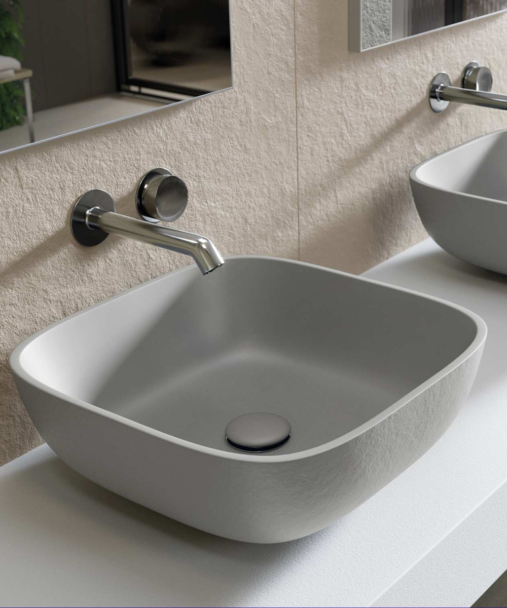 Esplora le possibilità del lavabo quadrato da appoggio On-Top Square. Questo lavabo in resina porta ordine e stile al tuo bagno. Personalizzalo con le texture Slate o Beton e scegli tra un'ampia gamma di colori. Questo lavabo quadrato si abbina perfettamente al piano One per un bagno ricco di colore e texture.