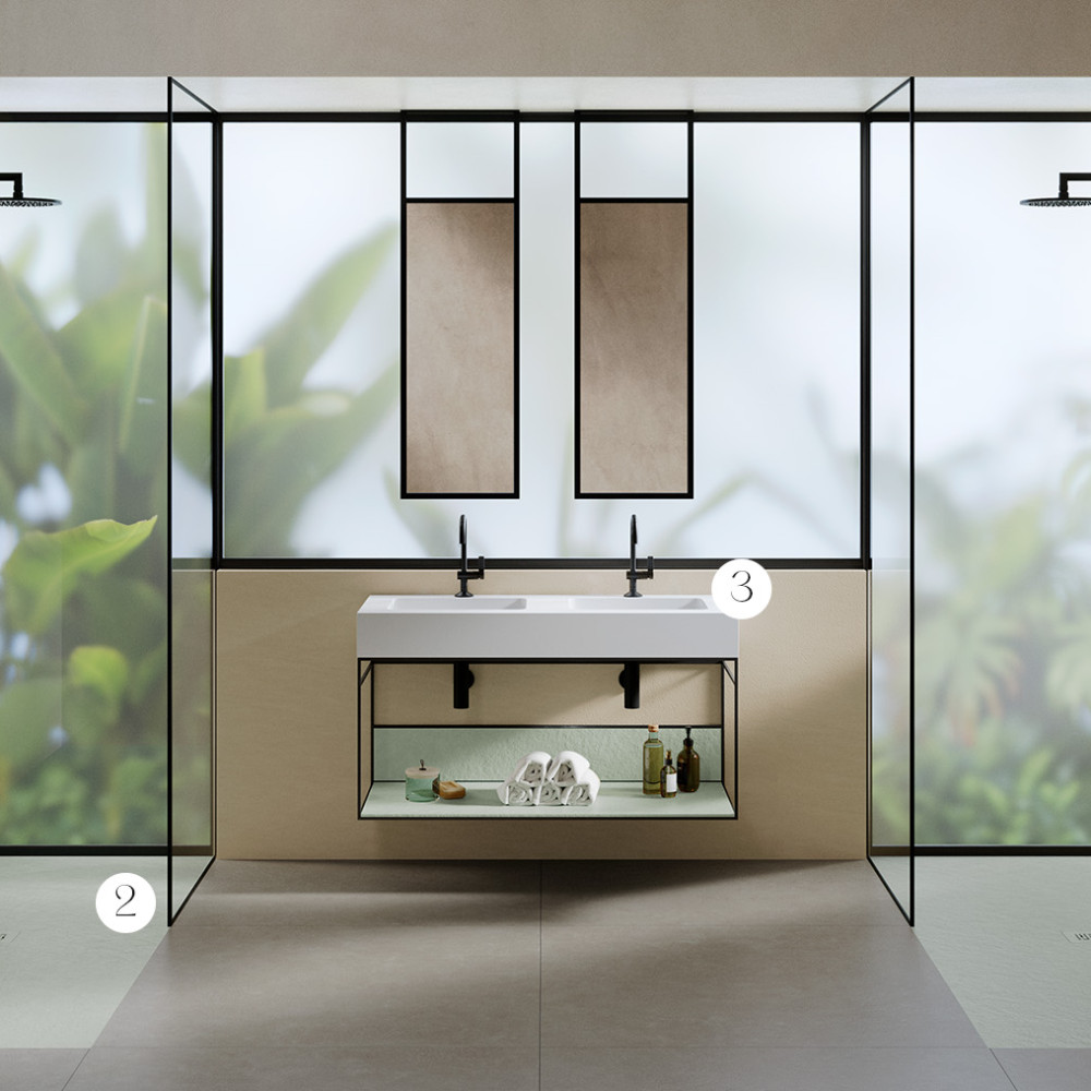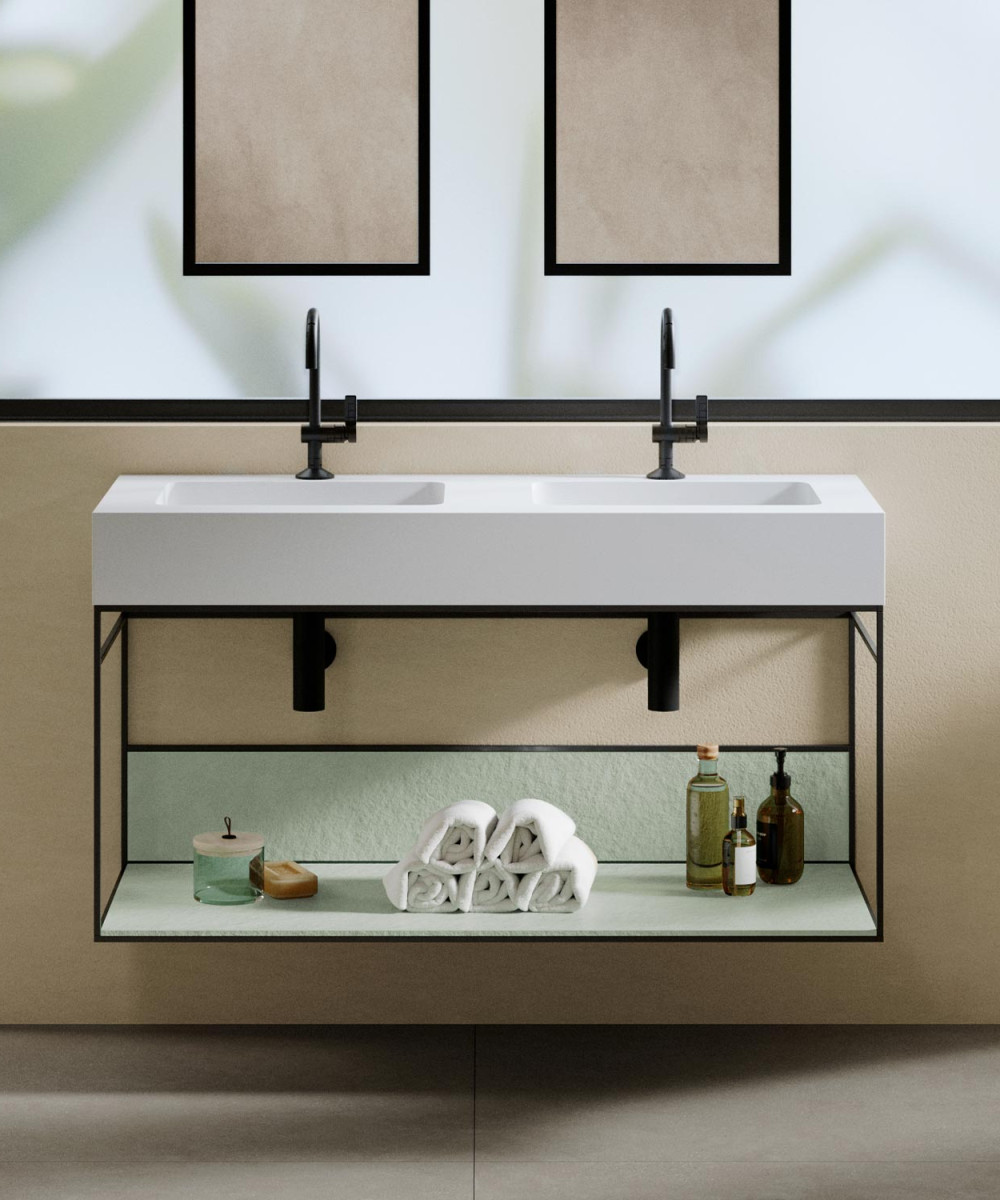 Il mobile da bagno Integra Akron aggiunge un tocco di stile industriale al tuo spazio. Questo mobile da bagno moderno combina l'essenza del nostro materiale Akron®, con le sue diverse texture e colori, insieme a una struttura in metallo nero. Integra Akron può essere combinato con i nostri piani lavabo.